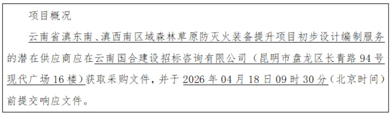 6.采购需求:云南省林火监测中心拟采购一家服务单位完成“云南省滇东南、滇西南区域森澳门威尼斯人博彩原防灭火装备提升项目”初步设计编制服务。出具项目初步设计成果并通过审批部门审批。