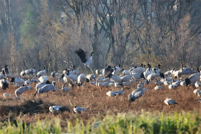 近日,位于云南曲靖的会泽黑颈鹤国家级自然保护区迎来越冬候鸟迁徙ꦬ高峰期。成群的黑颈鹤、灰鹤🌟在长海子、念湖等湿地栖息觅食,与远山近水相映成趣,构成一幅生动和谐的生态画卷。黑颈鹤是国家一级保护野生动物,云贵高原是它们的主要越冬地。每年10月,包含黑颈鹤在内的越冬候鸟就会来到保护区,直至次年3月底迁徙离开。保护区管护局局长肖良开介绍,长期以来,这里形成了黑颈鹤依赖传统农耕生产的独特人文生态景观,人鹤伴生已是这里的代名词。