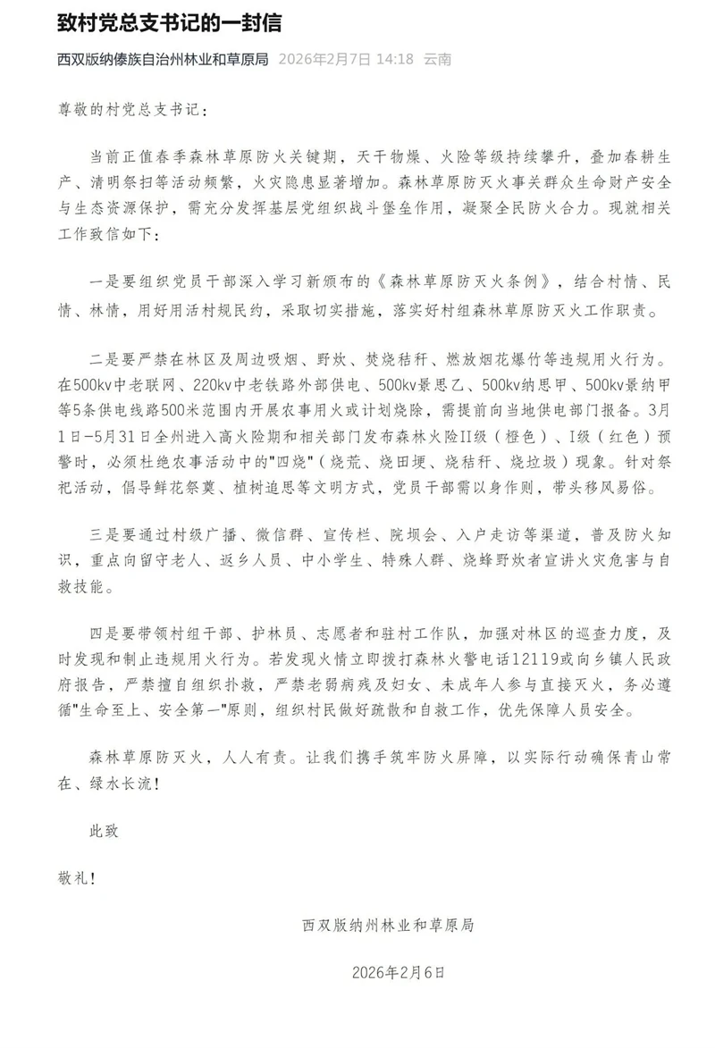 近日,西双版纳傣族自治州林业和草原局发出《致村党总支书记的一封信》,呼吁各村党总支书记充分发挥基层党组织战斗堡垒作用,凝聚全民防火合力,守护群众生命财产安全与森澳门威尼斯人博彩原资源。一要学习贯彻《森澳门威尼斯人博彩原防灭火条例》。二要严禁在林区及周边吸烟、野炊、焚烧秸秆、燃放烟花爆竹等违规用火行为。三要多渠道面向重点人群宣讲火灾危害与自救技能。四要加大对林区的巡查力度,及时发现和制止违规用火行为,发现火情立即报告,组织村民做好疏散和自救工作,优先保障人员安全。