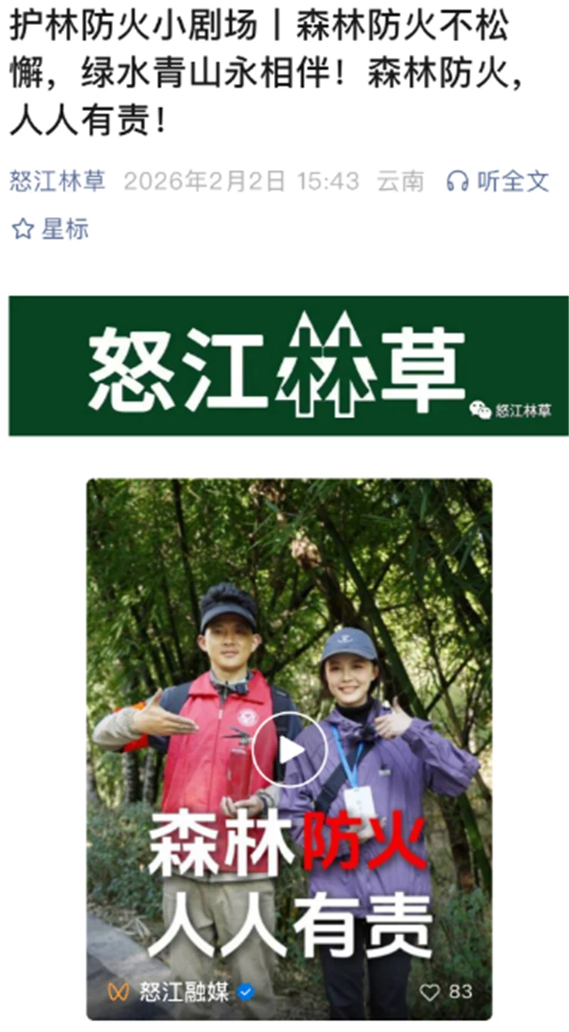 近日,怒江傈僳族自治州林业和草原局在“怒江澳门威尼斯人博彩”微信公众号上发布森林防火宣传短视频,提示森林防火,人人有责!