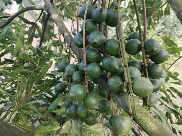 5.技术创新。形成澳洲坚果提质增效关键技术“1244”法。1种果园生草法:挖除恶性杂草,保留自然草,每年刈割2~3次压青,增加土壤有机质,提高土壤肥力;2次水:在花芽分化初期1月底~2月初、谢花坐果期3月底~4月初,各浇灌1次,土壤水分达田间持水量60%;4次施肥:全年施肥4次,分别在花期(N∶P2O5∶K2O=15∶5∶15)、坐果期(N∶P2O5∶K2O=15∶5∶25)、壮果期(N∶P2O5∶K2O=15∶5∶25)、采果后(N∶P2O5∶K2O=15∶5∶15+有机肥)进行,施肥量各占全年用量的占比为3∶2∶2∶3;4种修剪法:一是控制树高不超过种植行距;二是剪除树干0.5m以下枝条;三是疏剪过密枝条;四是回缩株间交叉的过长枝条。