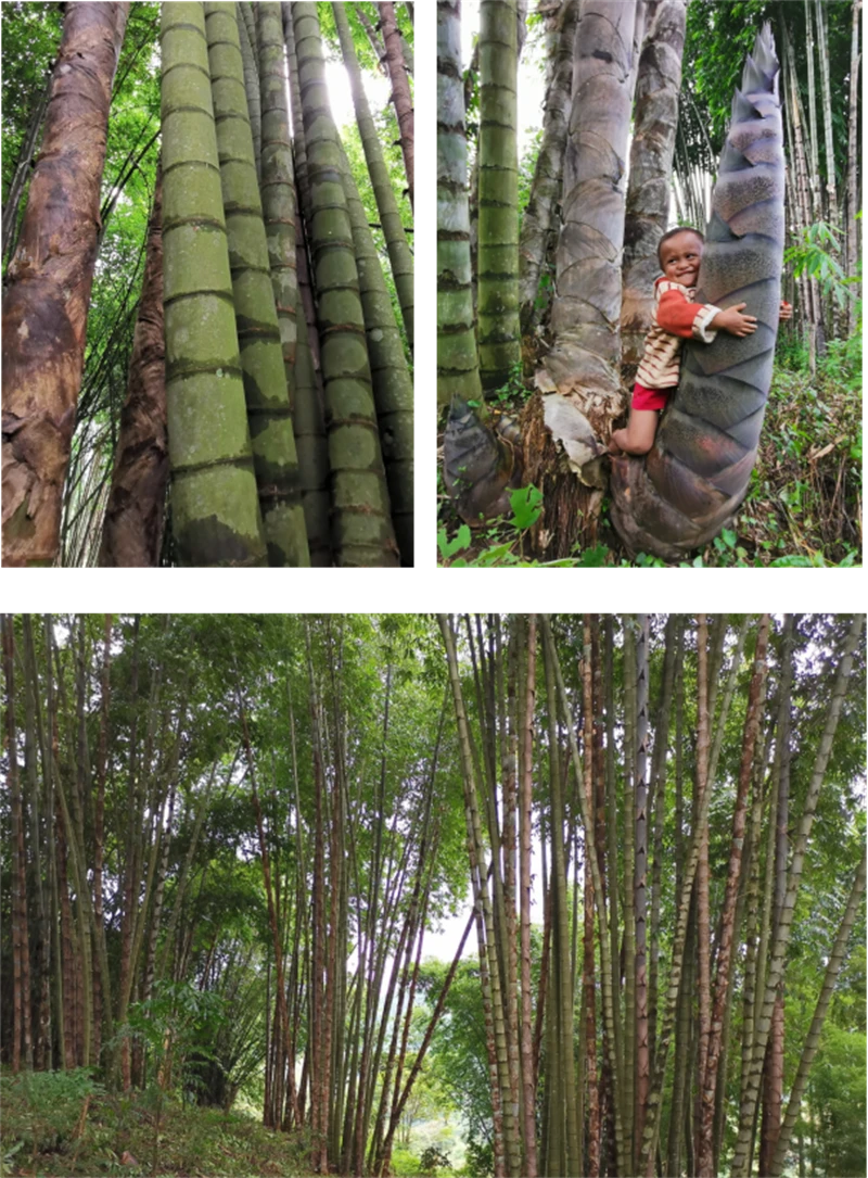 2.关键技术。(1)推广良种、壮苗技术。由于巨龙竹无性繁殖较为困难,秆型粗壮也不宜分蔸移栽,因此采用萌生小竹蔸精准培育成袋苗造林。(2)散点栽培、生态经营技术。由于巨龙竹对生长地立地条件要求较高,以培育特大径级秆材为目标造林时,可选择土壤肥沃、水分条件较好的疏林地和灌木林地,进行单丛或数丛散点栽培,精准培育。地形条件较好的沟谷、平地、缓坡宜林地,土层厚度>30cm,坡度<25°,也可采用集中造林,培育相对集中连片材用竹林。(3)集约管理、精准施肥技术。根据立地条件和造林方式采用不同的初植密度,一般为10~11丛/亩,株行距8m×8m。采用水肥一体化精细管理模式,施用有机肥50~80kg/丛,氮钾复合肥2~3kg/丛,每年12月至翌年3月结合松土抚育进行环状施肥。另可撒播绿肥,效果较好,特别要保证旱季水分供应。