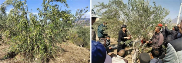 2.关键技术。(1)品种改良技术。针对项目点树体老化、花期不一致、挂果率低的品种,采用隔株高接换优、降冠疏密等方法进行品种改良和树形调控。改良后增加了主栽品种,优化品种搭配,解决了区域种植品种单一、种植密度大、炭疽病感染严重等技术问题,从而增加了有效结果面积,预防病虫害的发生。(2)规范化管理技术。开展土肥水管理、修剪、病虫害防治等技术措施,进行规范化种植示范。适时松土除草,按需浇水,科学施肥,促进油橄榄花芽分化、开花坐果,有效提高油橄榄品质和产量。病虫害防治主要在金龟子危害严重的区域安放黑光灯,诱杀成虫;介壳虫、炭疽病,采用人工防治及无人机飞防相结合,群防群治,有效防止病虫害的发生。修剪结合果实采收开展,既解决了树体顶部采摘困难的问题,又解决了修剪的问题,省时省力,提高效率的同时,降低了成本。(3)林下种植技术。开展油橄榄林下药材、经济作物等复合种植试验示范。利用油橄榄大树对林下作物的遮荫作用,节省了搭建遮荫网的成本;通过林下作物水肥管理,使油橄榄增加了水肥的吸收,增加了鲜果产量的同时,减少了对油橄榄管理的投入。