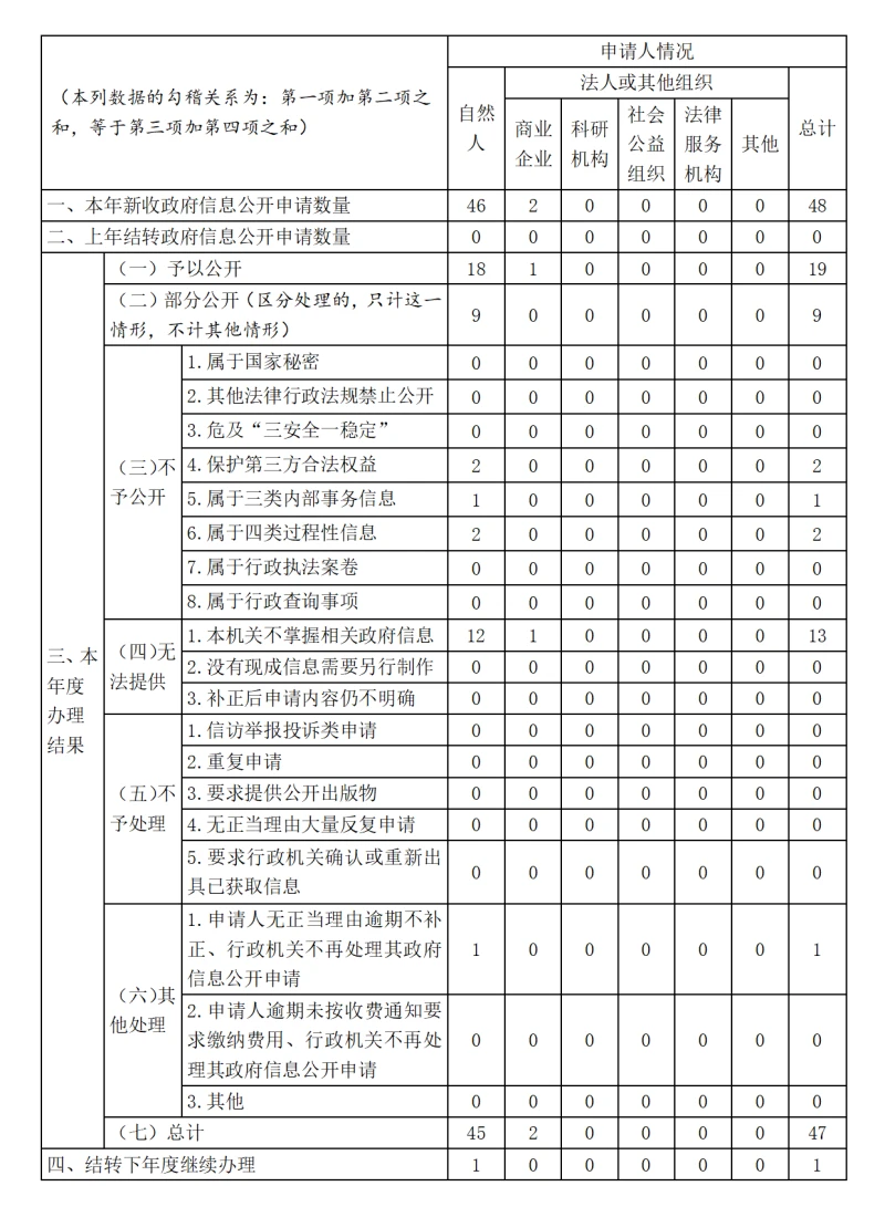 (二)规范依申请公开方面。畅通线上、线下申请渠道,强化服务理念,专人负责依申请公开工作,保障企业和群众合理信息需求,认真落实办理责任,严格办理时限,确保从接收、登记、审核、办理、答复到归档全流程规范管理,持续提升依申请公开水平。全年共收到政府信息公开申请48件,已办结47件,结转下年度办理1件,未发生投诉举报、行政复议、行政诉讼等有关情况,未出现被纠正行政行为。