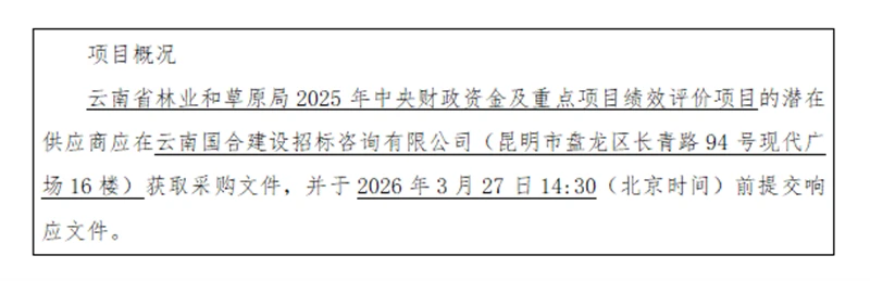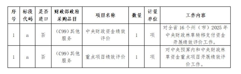 6.采购需求:采购一家供应商提供2025年中央财政资金绩效评价及重点项目绩效评价服务。中央财政资金绩效评价范围包含2025年林业草原改革发展资金和林业草原生态保护恢复资金,评价对象为16个州(市),选取部分重点州(市)进行实地评价,最终形成各州(市)、各项目绩效评分,并出具绩效评价报告。重点项目绩效评价以该项目资金安排使用和过程管理情况为重点,选取中央预算内资金以及中央财政资金的重点项目,结合中央财政资金实地评价等工作,通过项目跟踪复核、数据统计分析等,动态掌握项目目标实现程度、资金支出进度等,对绩效评价中发现的问题及时反馈、督促整改、加强纠偏。