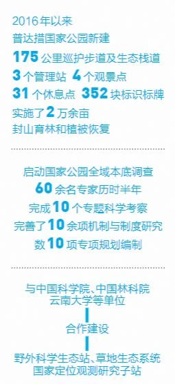 “给子孙后代留下珍贵自然遗产。”2016年以来,在政府主导的多元化资金保障机制下,普达措国家公园利用中央预算内保护利用基础设施建设项目和湿地保护与恢复资金共计1.1亿元,新建了175公里的巡护步道及生态栈道、3个管理站、4个观景点、31个休息点、352块标识标牌,实施了2万余亩的封山育林和植被恢复,建设了资源监控平台,完善了界桩界碑、安防监控、森防监控、污水处理等设施;利用省、州专项工作经费,启动了国家公园全域本底调查,组织60余名专家历时半年完成了10个专题科学考察,全面摸清掌握了普达措国家公园范围内的重要自然资源本底和生态状况,完善了特许经营、生态补偿等10余项机制与制度研究,以及解说、居民点调控等数10项专项规划编制;吸引社会资本2400余万元建设了免费开放的科普宣教中心,改造建设自然教育基地;与中国科学院、中国林科院、云南大学等单位合作建设野外科学生态站、草地生态系统国家定位观测研究子站,科研监测能力得到极大提升。