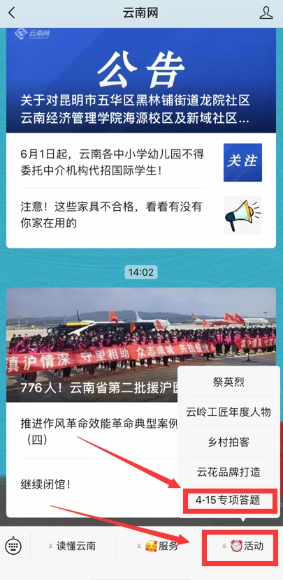 方式一是关注“云南网”微信公众号,通过“活动”菜单栏进入“4·15 专项答题”答题页面。