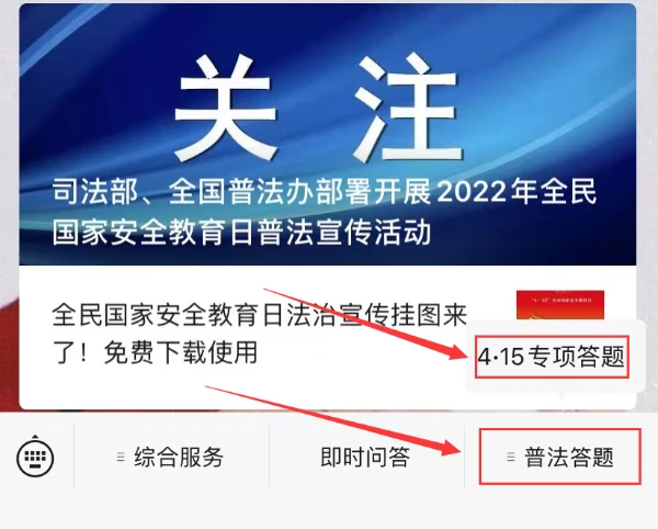 方式二是关注“云南普法”微信公众号,通过“普法答题”菜单栏进入“4·15 专项答题”答题页面。