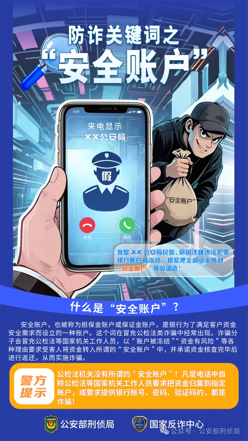 警方提示:公检法机关没有所谓的“安全账户”!凡是电话中自称公检法等国家机关工作人员要求把资金转到指定账户的,或要求提供银行账号、密码、验证码的,都是诈骗!