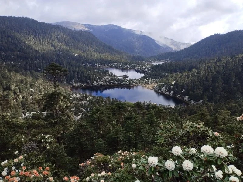 丽江老君山九十九龙潭省级重要湿地有数十个冰蚀湖和沼泽,冰蚀湖沿溪流成串分布,湖群周边分布有大面积的冷杉林、高山杜鹃等高山亚高山植被,以及高原沼泽化草甸,有湿地维管植物67科182属296种,湿地脊椎动物13目30科76种,湿地景观特色鲜明,极具有典型性和代表性。